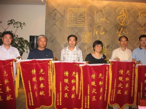![]() 向抗震救災(zāi)中無(wú)私奉獻(xiàn)、積極捐贈(zèng)檢測(cè)儀器設(shè)備的單位和 做出突出貢獻(xiàn)的監(jiān)督機(jī)構(gòu)贈(zèng)送錦旗,右三為中心楊曉虹總經(jīng)理