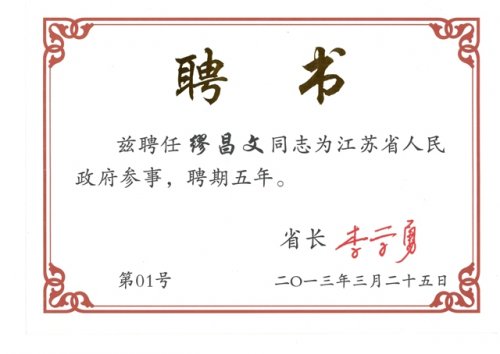 | 我院董事長繆昌文院士獲聘“江蘇省政府參事” |