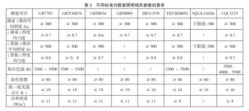 目前我國關(guān)于中小學(xué)教室照明標(biāo)準(zhǔn)包括國家標(biāo)準(zhǔn)、團(tuán)體標(biāo)準(zhǔn)、地方標(biāo)準(zhǔn)及技術(shù)指引。部分標(biāo)準(zhǔn)中關(guān)于教室照明相關(guān)參數(shù)的要求見下表1。 表1 不同標(biāo)準(zhǔn)對教室照明相關(guān)參數(shù)的要求