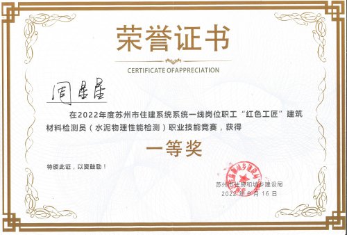 近日,由蘇州市住房和城鄉(xiāng)建設局、蘇州市總工會、蘇州市人力資源和社會保障局、共青團蘇州市委聯(lián)合主辦的2022年度蘇州市住建系統(tǒng)一線崗位職工“紅色工匠”建筑材料檢測員(水泥物理性能檢測)職業(yè)技能競賽活動在蘇州順利開展。中心蘇州地區(qū)員工積極報名參加,其中,子公司蘇州工業(yè)園區(qū)建設工程質(zhì)量檢測咨詢服務有限公司(以下簡稱“蘇州咨詢”)員工周星星喜獲一等獎。
